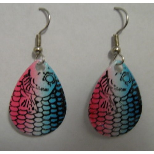 These earrings are made out of real metal Colorado spinner blades used in fishing. The spinners have fish detailing with crystal sparkles. They are a lot of fun to wear. Each pair of earrings are 1” by ¾ wide with silver earring wires. Price is per pair.